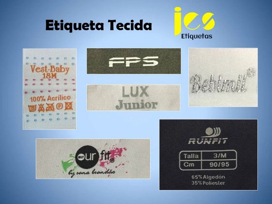 • Etiquetas de preço e de marca: São usadas no setor têxtil para distinguir as peças de roupa e mostrar ao cliente as informações de cada artigo, como o nome da marca, o tamanho, o preço, a composição, a origem e os cuidados a ter. Estas etiquetas podem ter um design criativo e atrativo para chamar a atenção do consumidor e transmitir a imagem da empresa.